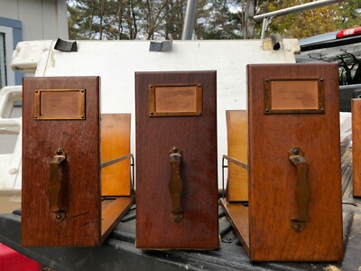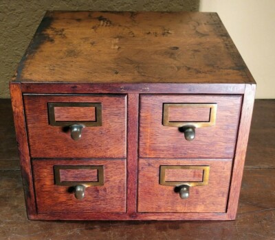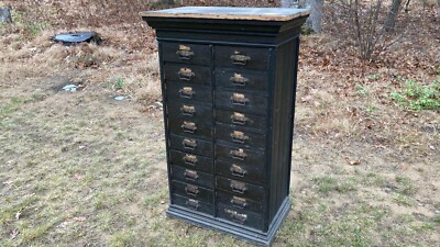 |                                                                                       A Great Antique Shaw Walker 4 drawer wooden filing cabinet. It has the dovetail joints and the"Shaw Walker" name on the top. One drawer has the metal card holder. The other 3 do not. Please see pictures) There are two slight cracks in the bottom of two drawers. It does have wear consistent with it's age. There are knicks. Marks, dings, finish loss, a crack here or there, and the one side does have a black substance(looks to be old glue from some type of label) on it, as seen in the picture. The pulls are wooden with a screw in the center. The pulls appear to be old cut wood thread spools, 2 are from the old Berksire& Beckett Silk Co, one has some type of"Clark" label worn off& the 4th is unmarked. There is one round hole underneath the the pull of both the top& bottom right drawers. I also had a question                                                            ... more                              about the stain on the bottom, I am not sure if it is oil or water. Bottom has 4 round metal feet& is engraved with the number"350" The cabinet measures approx. 14 1/2" long(not including drawer face or pulls) X 9 1/2" tall X 13 5/8" wide. Please view all pictures and ask any questions before bidding. As I am selling"AS IS" and will not accept a return on this item. NOTE: $2.00 has been added to the shipping invoice to help cover the cost of packing material. Delivery confirmation& insurance. PAYMENT IS REQUIRED WITHIN 3 WORK DAYS OF END OF AUCTION. I USUALLY SHIP THE NEXT BUSINESS DAY FOLLOWING RECEIPT OF CLEARED PAYMENT. EXCEPT FOR WEEKENDS AND HOLIDAYS. IF FOR SOME REASON THERE IS A SHIPPING DELAY, THE BUYER WILL BE SO NOTIFIED. ALSO, WHEN LEAVING FEEDBACK CONCERNING SHIPPING TIME, PLEASE DO NOT RATE ME ON THE AMOUNT OF TIME IT TAKES FOR THE CARRIER TO DELIVER THE ITEM TO YOU. FOR EXAMPLE, IF YOU OPT TO USE USPS PARCEL POST, WHICH IS A CHEAPER FORM OF SHIPPING, IT IS ALSO MUCH SLOWER AND IT TAKES LONGER FOR YOU TO RECEIVE THE ITEM. AS SUCH, I SHOULD NOT BE"PINGED" ON THE TIME IT TAKES THE CARRIER TO DELIVER THE ITEM TO YOU                             |                          |                                                                                       Stunning Antique Yawman and Erbe Oak Wood Cabinet with dovetail joints. This two drawers cabinet has the original inscribed pulls and Yawman and Erbe Mfg Co Rochester NY brass name tag. The Two Drawers have the original metal paper holders inside(which read Pat June 8-02) One drawer still has the original loose paper index. The perfect table top cabinet with the most gorgeous grain. Measurements: 14" Depth x 9.5" Tall x 11" Width condition is very good with wear to the wood on the back bottom right(pictured) weighs 14lb Shipping: Will be very well packaged and insured for safe arrival.                             |                          |  |                          |                                                                                       PLEASE READ Terms of Bidding on Any Item I have listed. Shipping Cost by Canada Post. All items will be Shipped with Insurance. If I make a mistake or any issues please email and a Full Refund will be issued Quickly. I would hope that 5 stars can be let for this service. Thank you for your time. Vintage/Antique Dove Tail Oak Wood Filing Cabinet. This is made by Office Specialty Mfg Co Newmarket Canada. The cabinet measures approx 17" x 13 1/4" x 5" I believe this is in good condition for age. As per pictures. On the side there is a split where the wood joins I think this a beautiful. Shipping is with Canada Post www.canadapost.ca. Insurance is included Canada With Tracking Approx 12.00 to 28.00 Please email Postal Code for a Closer Quote. Delivery 10/12 Business Days. U.S.A. With Tracking Approx 30.00. to 35.00 Please email                                                            ... more                              zip code for a closer quote.Approx 11/16 Business Days No Overseas Insurance Please See All Pictures or Email for more Information. Thanks                             |                          |                                                                                       ANTIQUE WOOD OFFICE FILE CABINET We are offering for sale an antique wooden file cabinet. UNIQUE with 8 drawers! Exact age and origin unknown but believe to be from the late 1800s to early 1900s. Noted hand dovetailed drawers. Paneled sides and back. Can be positioned any where in the room. Came from an old railroad office. Please check out our metal industrial cabinet from the same liquidation. Thanks for looking. GREAT STORAGE FREE LAYAWAY AVAILABLE FREE STORAGE UP TO 6 MONTHS* Email your zip code for a shipping quote SIZE: 52" high x 31 1/4" wide x 28 1/4" deep Approx 200 pounds CONDITION: Overall good used condition. Solid and sturdy. Shows appropriate use wear and markings including some scratches. Nicks, minor chips and bruises. Overall a very nice EARLY and UNIQUE piece. See photos for condition and details. Be sure                                                            ... more                              to add me to your! SHIPPING PLEASE BE SURE TO CHECK ON SHIPPING PRICES BEFORE YOU BID OR BUY SHIPPING IS NOT FREE WE WELCOME PICKUPS! Item is located in Duncannon Pennsylvania 17020 Storage is FREE up to 6 months and longer with prior approval Buyer responsible for paying the shippers directly for all shipping costs incurred. Delivery time will vary depending on shipper. Please be patient. We would be happy to work with a shipping company of buyer's choice. We work with multiple furniture shipping companies to obtain the most reasonable shipping quotes for the buyer. We can offer guaranteed shipping quote to most areas in the continental US. Email your zip code for a shipping quote All shipping options are only suggestions. And you are more than welcome to use any shipper of your choice o